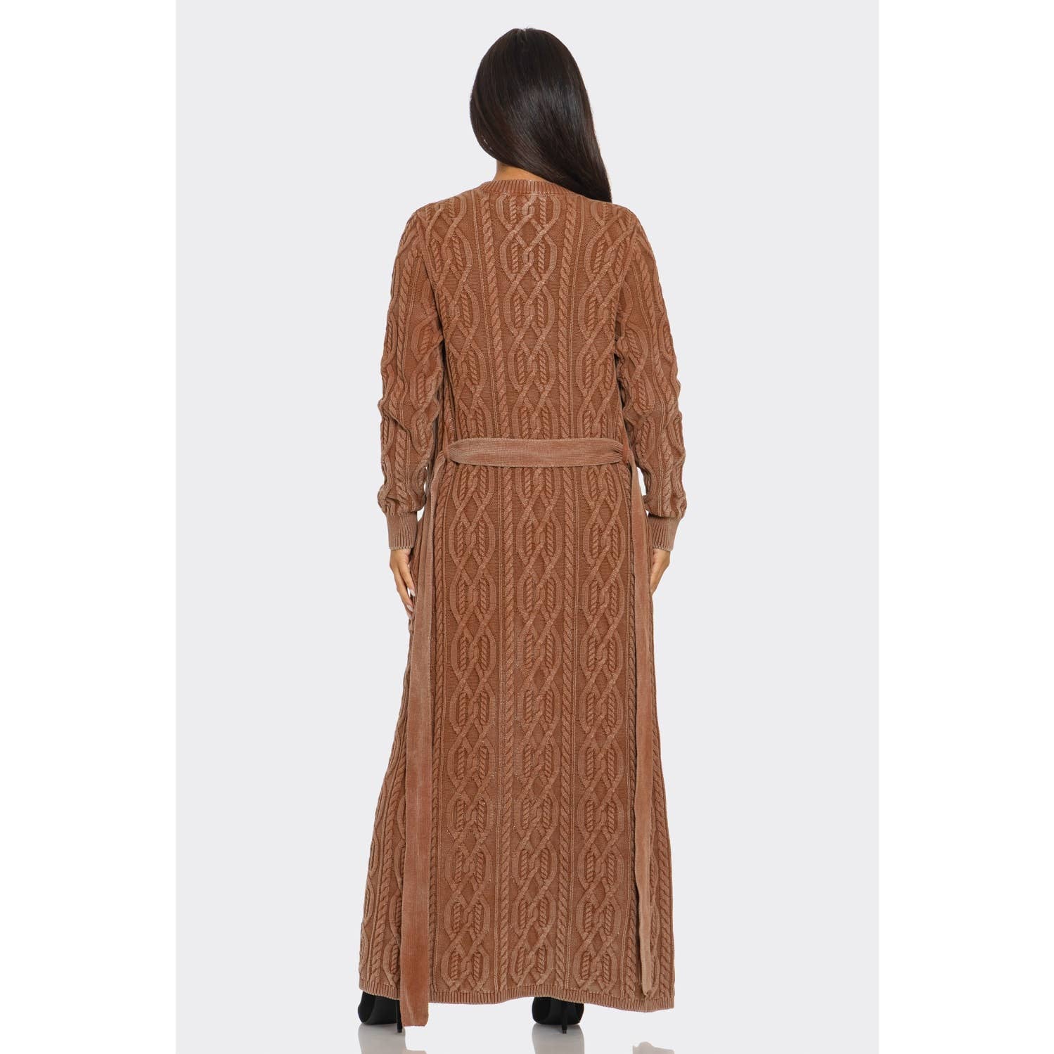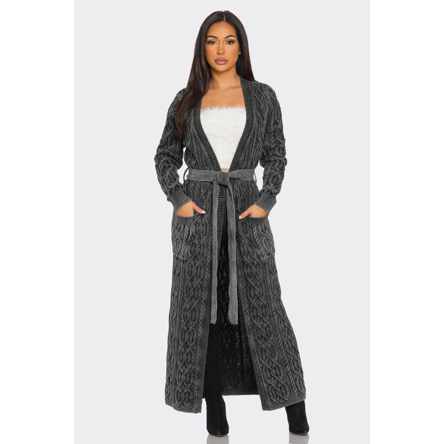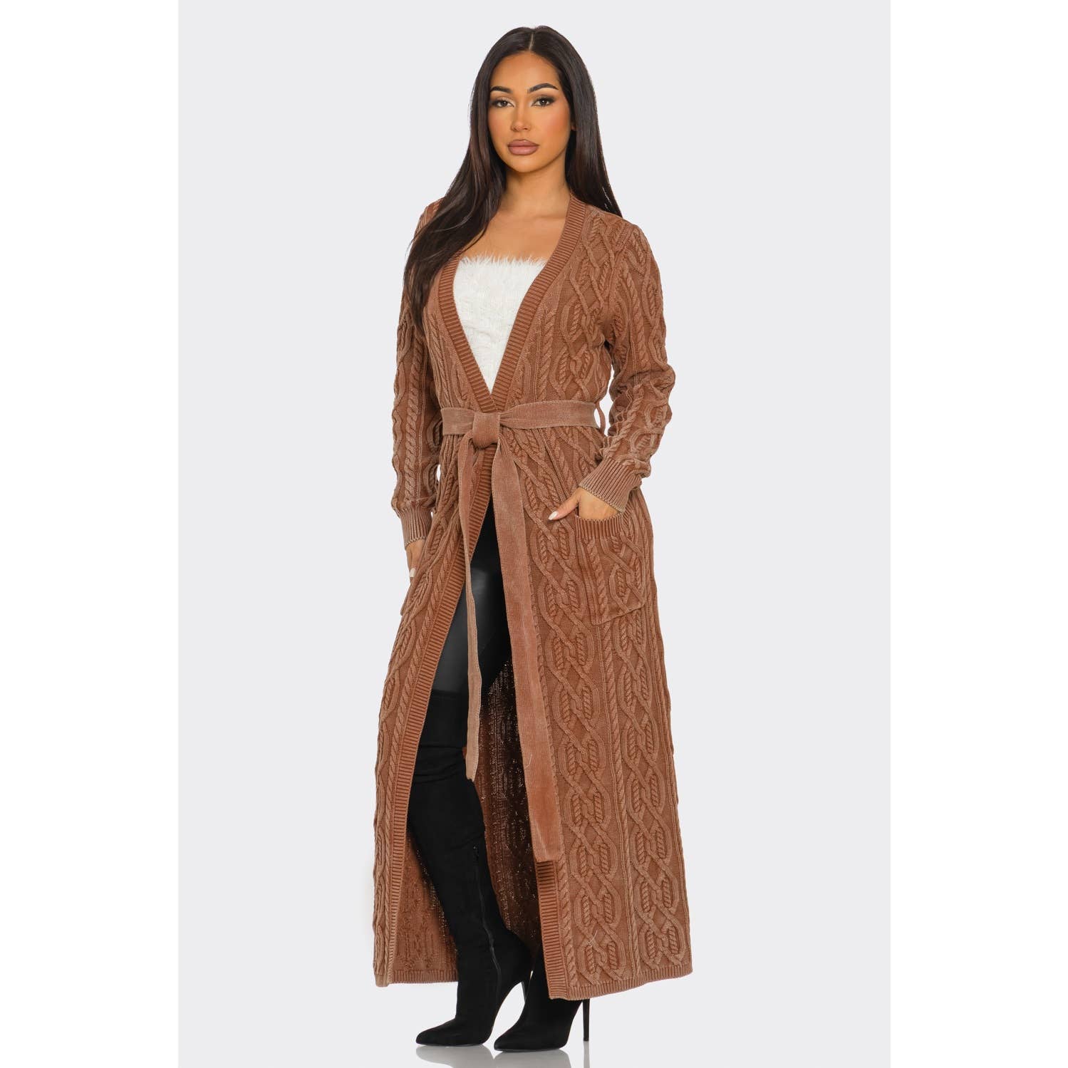 Cable Knit Longline Belted Cardigan. - Longline Cardigan / Duster - Cable knit design, tie belt, front pockets, open-front silhouette - Maxi (ankle length) - Relaxed yet structured with belt closure 100% Cotton